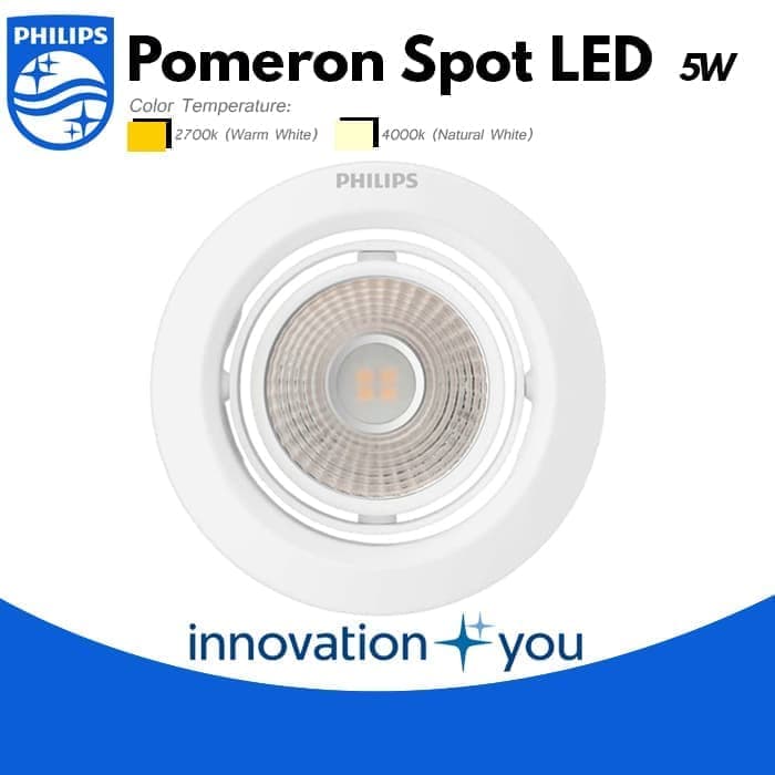Led Pomeron Spot-Embutido Led 5W/27K 9cm Philips SKU 2263063; Vida media: 15.000 Hrs; Temperatura Color: 2700K, Calido; Consumo Watt: 5W; Eficiencia: 58Lm/W; Flujo Luminoso: 290Lm; Foco Direccional;; Diámetro: 90mm