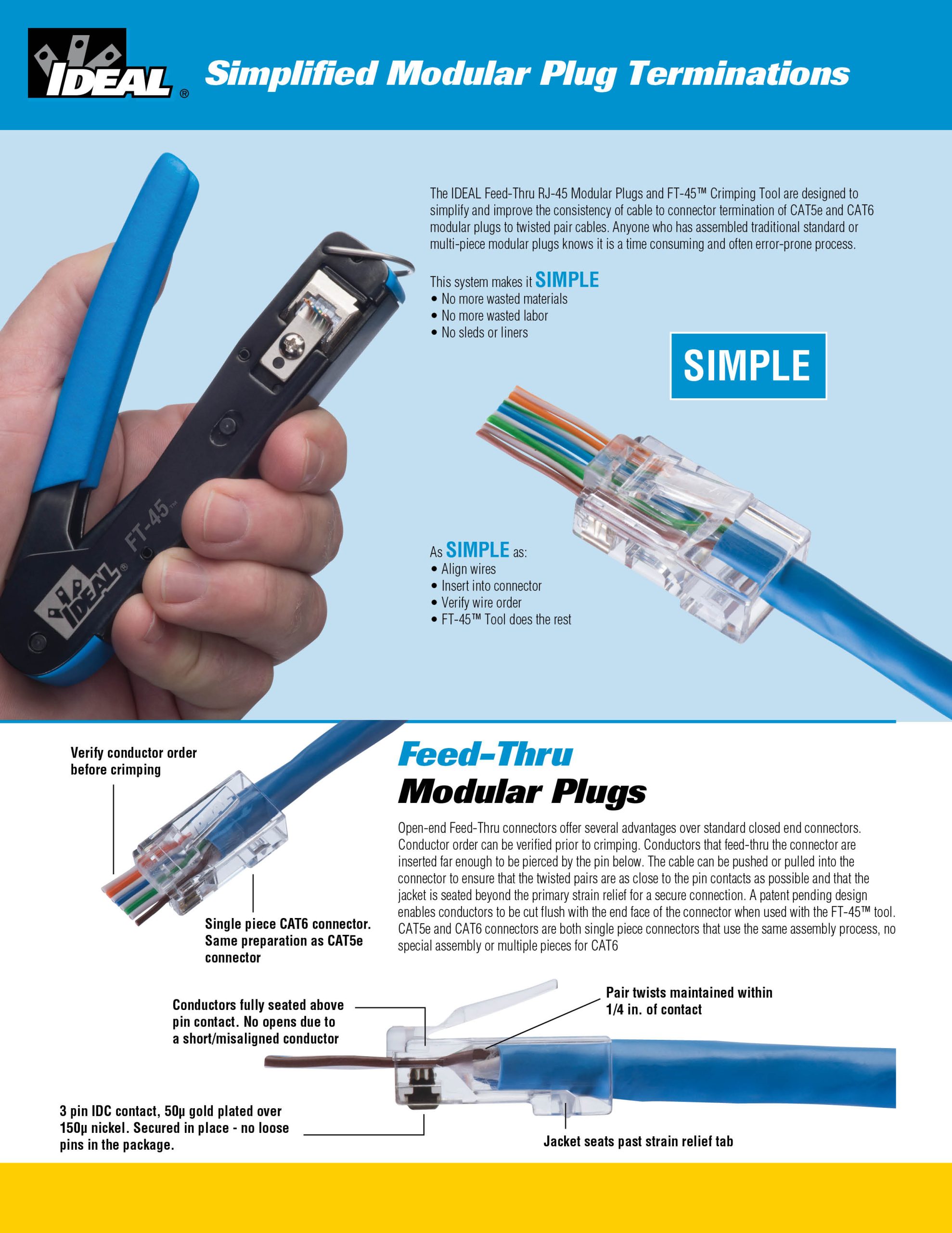 Herramienta modular IDEAL para RJ-45. Proporciona un corte al ras ningún exceso de conductor sobresale de la cara del enchufe. Crimpa de forma estándar de la industria CAT5e / 6 RJ-45 (8P8C) y enchufes modulares blindados. Crimp con menos fuerza, tamaño compacto y peso, cabe en su bolsillo. Compatible con enchufes modulares de estilo feed-th no IDEAL.